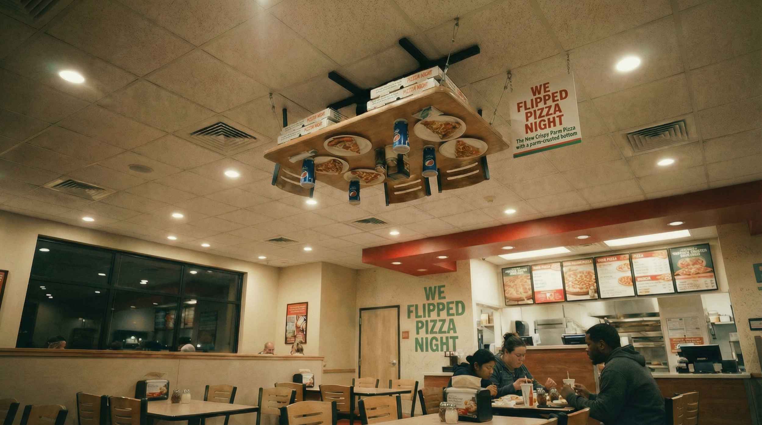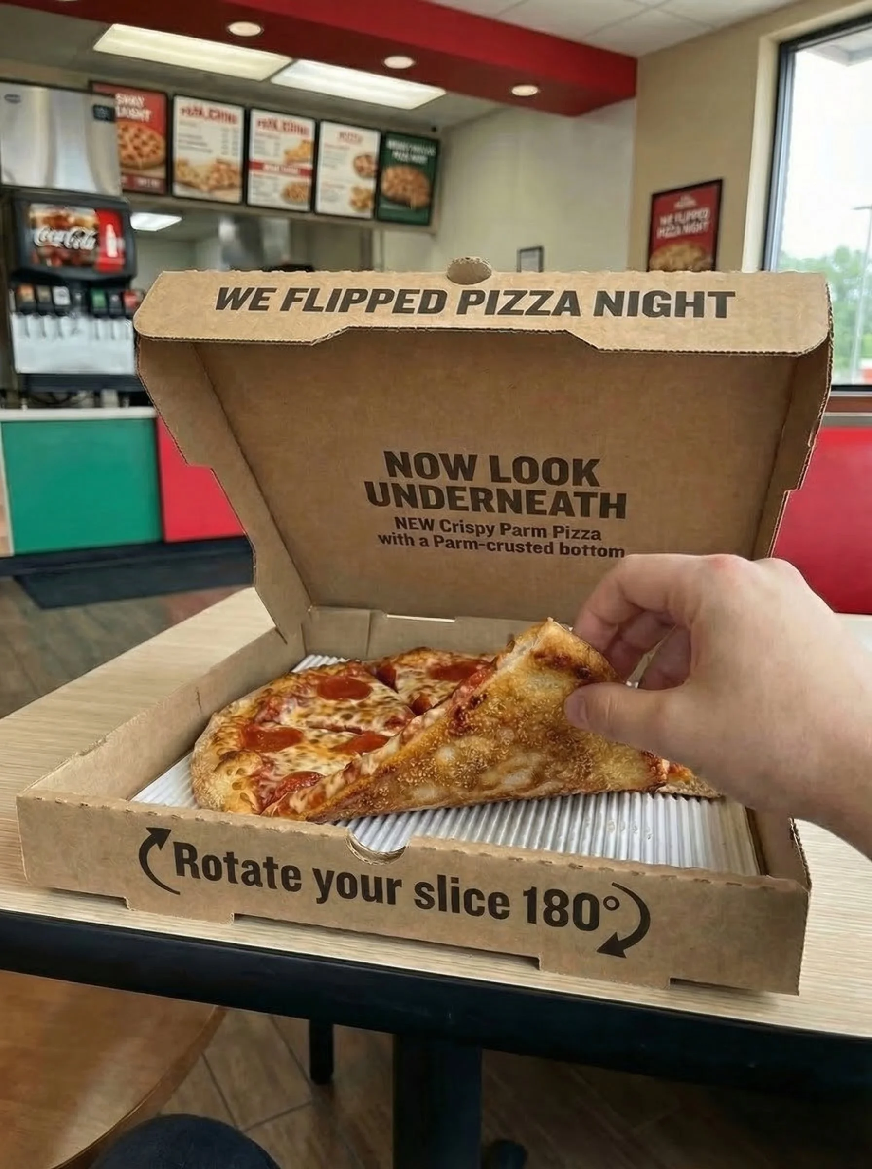 The whole point of the Crispy Parm Pizza is what's on the bottom of the crust. So we flipped a family upside down at dinner and put the bottom on top. It made the product difference impossible to miss without turning it into a lecture. The visual did all the explaining, and people got it immediately. Simple idea, clear message, and way more fun than talking about crust innovation.